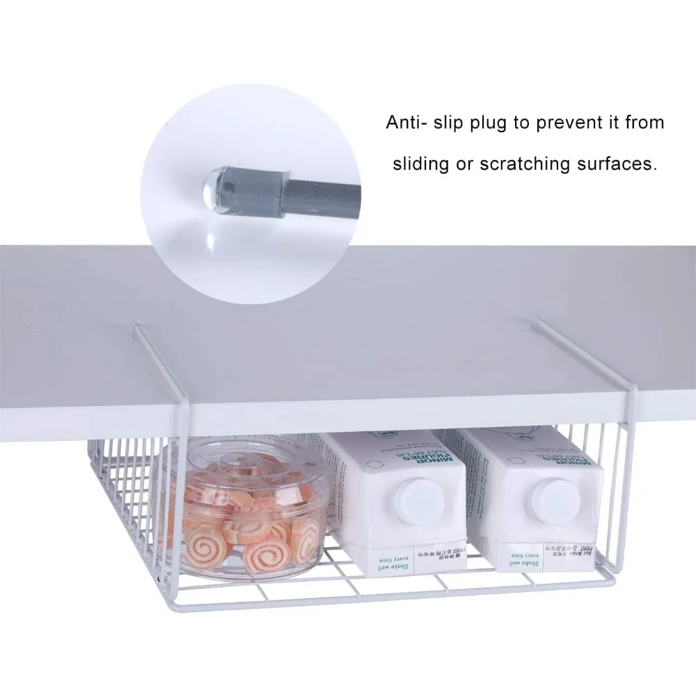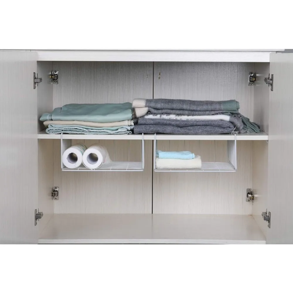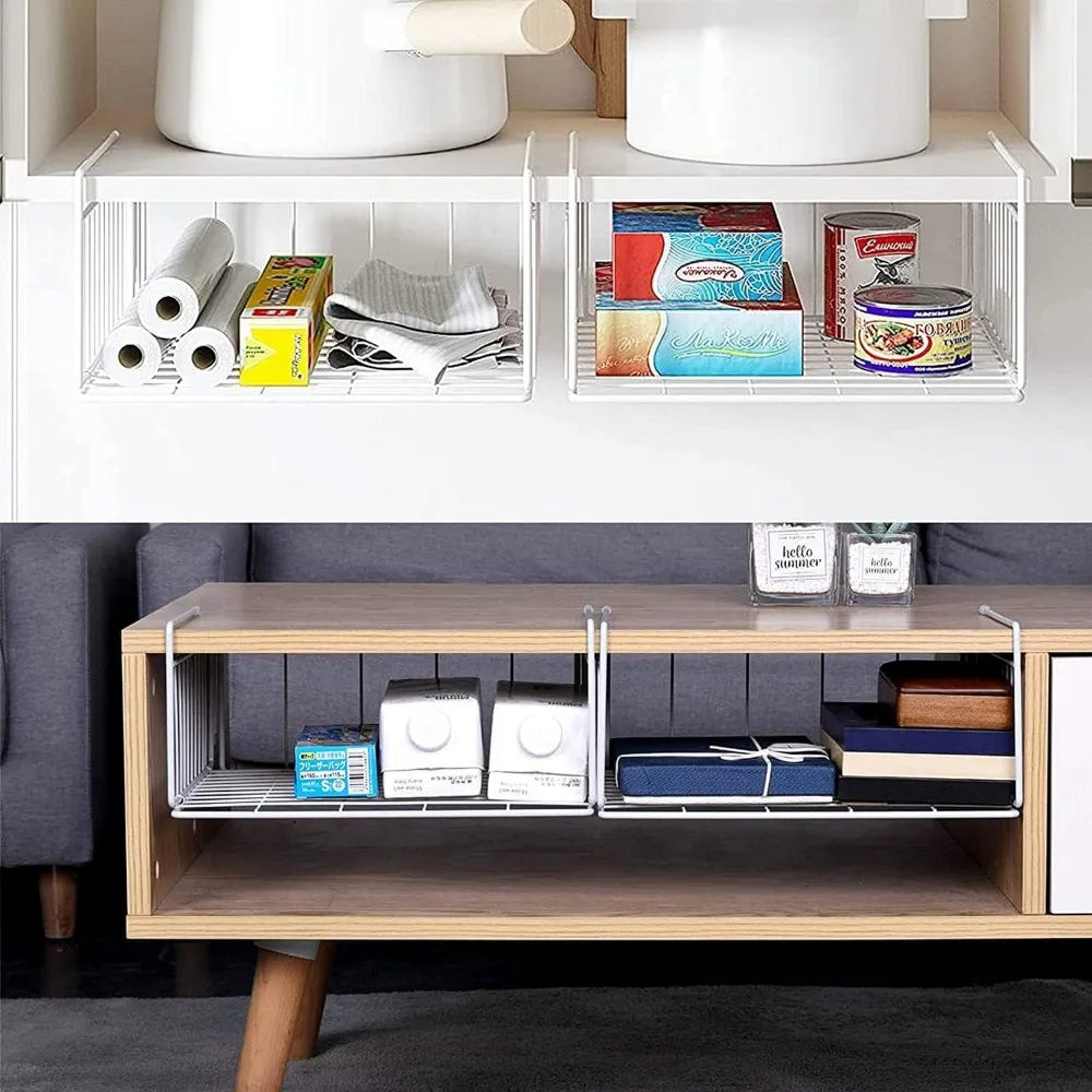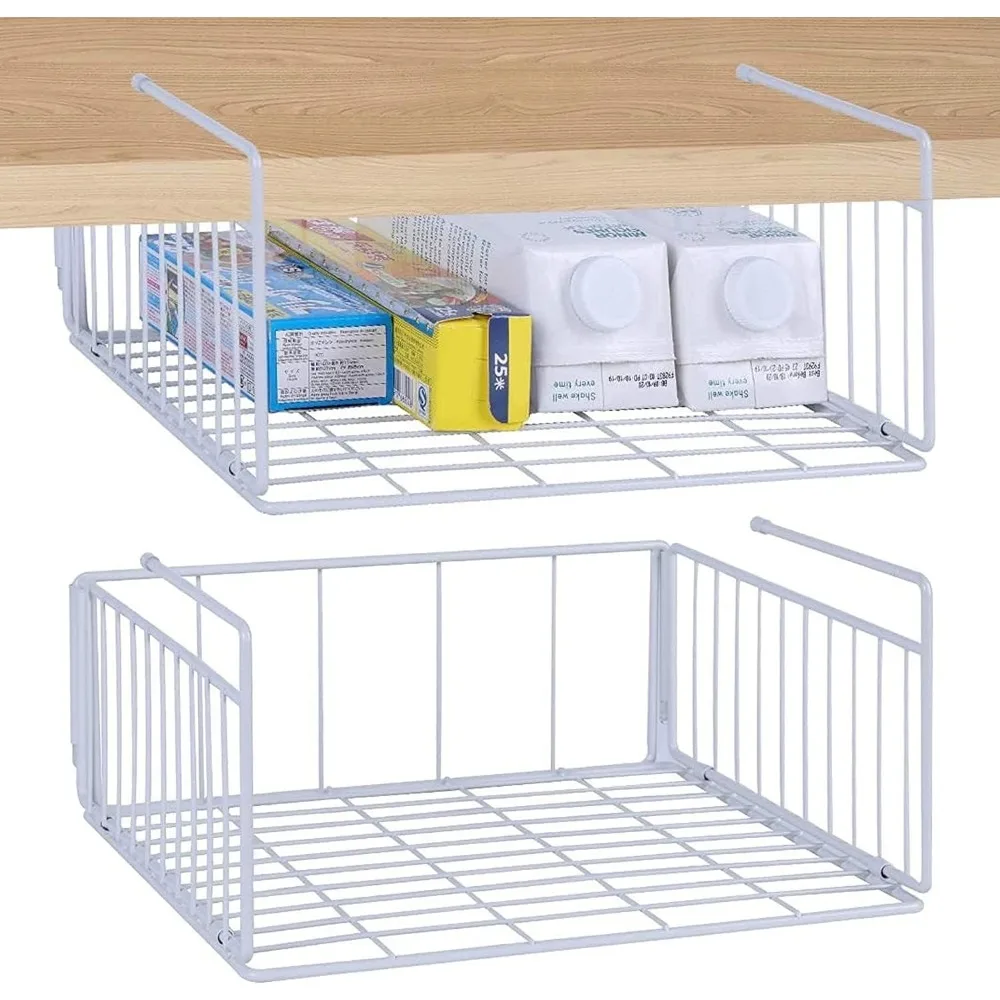 Maximize your storage space with this 2-pack of under cabinet hanging storage baskets. Designed to easily slide onto existing shelves, these wire racks create additional space for organizing pantry items, kitchen essentials, or refrigerator contents. With a sturdy structure that supports up to 22 lbs, they provide a reliable and practical solution for reducing clutter and improving accessibility.